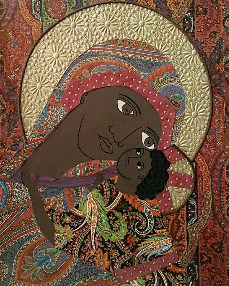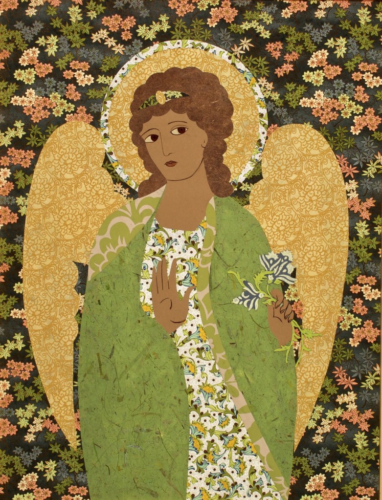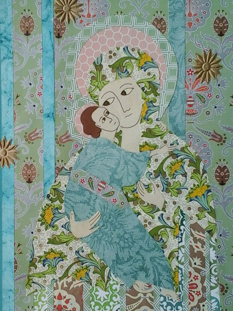 Theotokos, 2022, Ribbon, paper, embroidered paper, and acrylic paint, 36 x 48