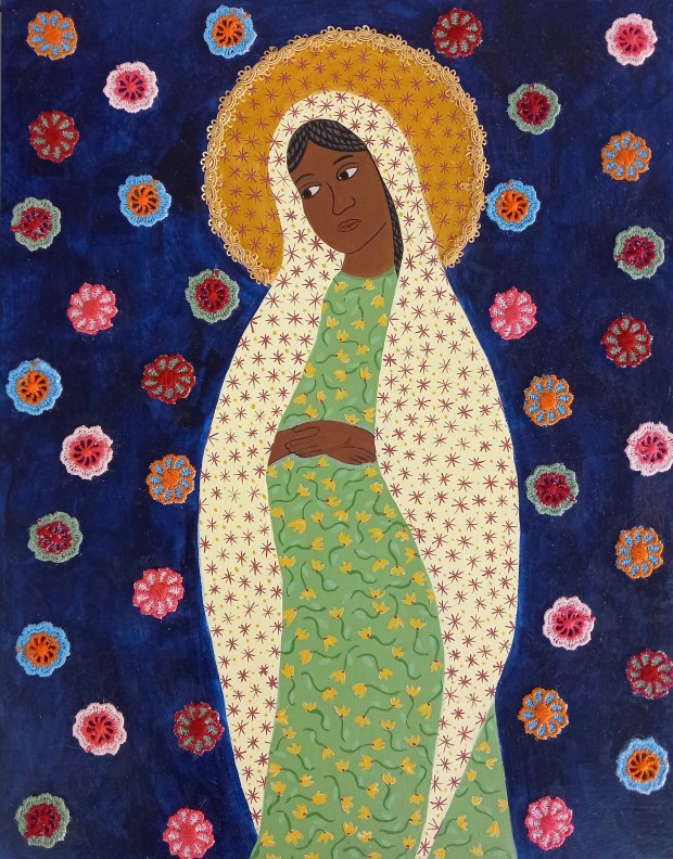 Floral Madonna, 2018, Embroidered paper, paper, and acrylic paint, 14 x 18, Sold